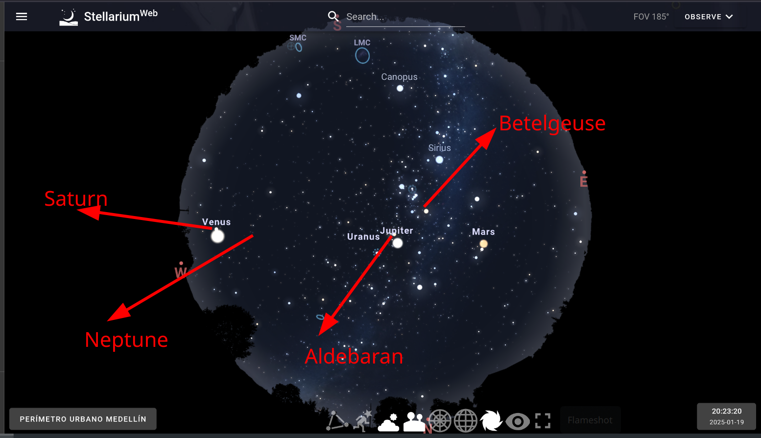 The time information provided below corresponds to Medellín, Colombia. In my case, I went out to observe the sky at 7 P.M., before the mountains affect visibility near the horizon.