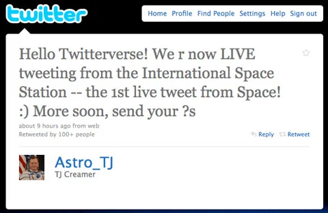 Sin embargo, podríamos considerar esto como trampa. El 23 de enero de 2010 NASA anunciaba en su cuenta oficial (@NASA) la llegada de internet al espacio, y los astronautas de la ISS publicaron en sus cuentas personales por primera vez sin intermediación en el espacio el tuit que figura en la imagen. De esta forma, fue como Timothy Creamer (@Astro_TJ) se convirtió en el primer astronauta en enviar un tuit desde el espacio, el 22 de enero de 2010.