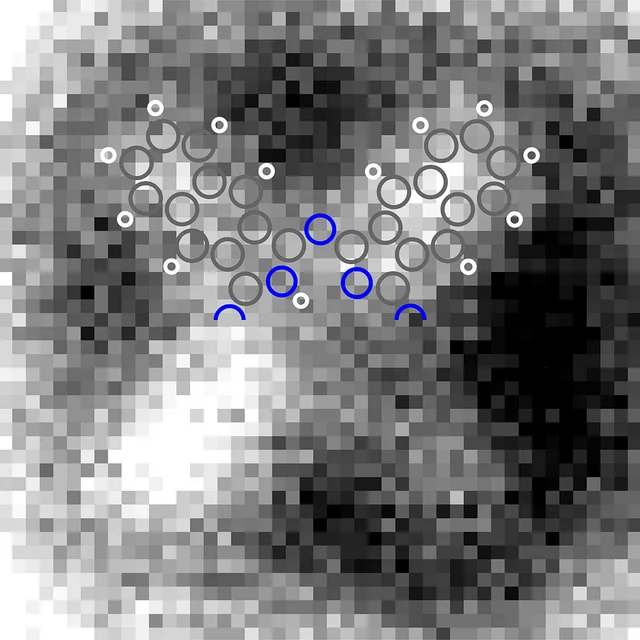Las siguientes micrografías son etapas del procesamiento de imagen de una observación de la tautomerización de la naftalocianina. La imagen en escala de grises corresponde a la micrografía original, donde se evidencian tonalidades claras y oscuras asociadas a distribuciones de carga más negativas o más positivas (no es directamente la medición de la carga, pero si de la intensidad del campo eléctrico, produciendo los fuertes contrastes debido a cambios en la dirección del campo eléctrico y no solo de su magnitud). Posteriormente se cambia el mapa de color, y por último se realizan suavizados de la imagen.