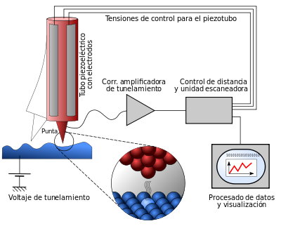La técnica usada, resultado de la modificación de la anterior, denominada KPFM (Kelvin probe force microscopy), es sensible adicionalmente a la carga. Esto se logra ya que la adaptación realizada esta basada en el uso de un STM (Scanning Tunneling Microscopy, o Microscopia de Efecto Túnel) la cual aplica una diferencia de potencial al montaje, volviendo este sensible a las propiedades eléctricas y conductivas de la muestra. Esta técnica esta basada en el efecto de tunelamiento de la mecánica cuántica, que en este caso se produce cuando se acerca mucho una punta conductora a la superficie de interés. En este momento, surge una diferencia de potencial entre la punta y la superficie, que puede causar la emisión de electrones con una cierta probabilidad y por ende inducir una corriente de tunelamiento. Esta corriente de tunelamiento es función de la posición de la punta, la diferencia de potencial aplicada y la densidad local de estados (LDOS) asociada a la densidad electrónica.