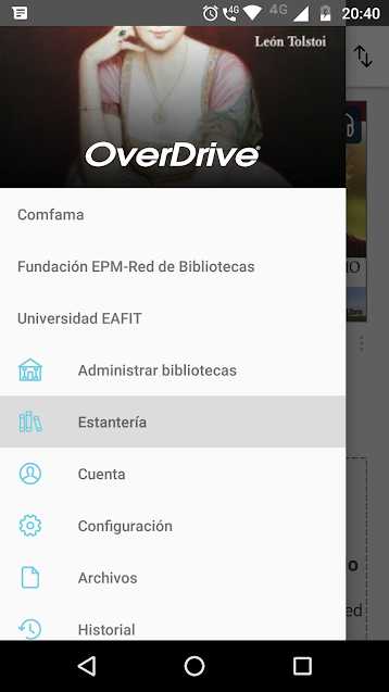 Menú lateral de Overdrive con listado de bibliotecas agregadas.¶