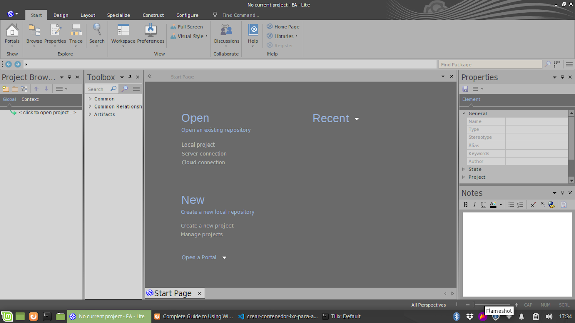Con estos beneficios (algo similar a lo discutido en Instalando paquetes en Linux (Mint)), procederemos a crear un contenedor para la ejecución de Enterprise Architect (la versión del visor, pero es aplicable a la versión completa). De manera oficial hay instrucciones para su uso en Linux con Wine pero la receta está incompleta (hay que agregar una instrucción más) y es mejor no ensuciar nuestro sistema de 64 bits con bibliotecas de 32 bits de manera innecesaria. Así que empecemos.