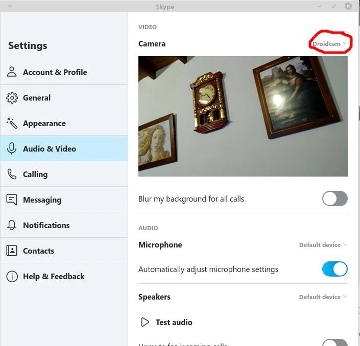 Para ejemplo, tomaré Skype, pero será igual con toda aplicación que soporte selección de cámara (aplica para Hangout, OBS, Teams, entre otras). En el menú respectivo, seleccionamos «DroidCam» y estamos listos.