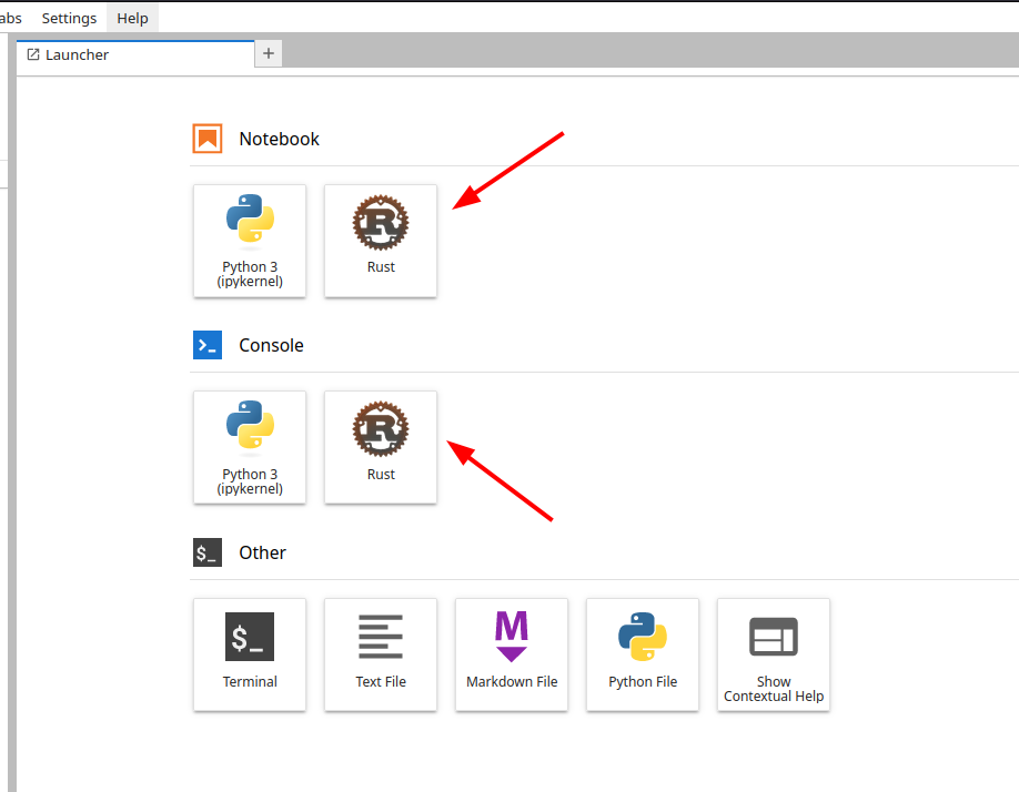 Una vez agregado, podemos abrir Notebook o Jupyterlab, y veremos la opción para usar Rust.